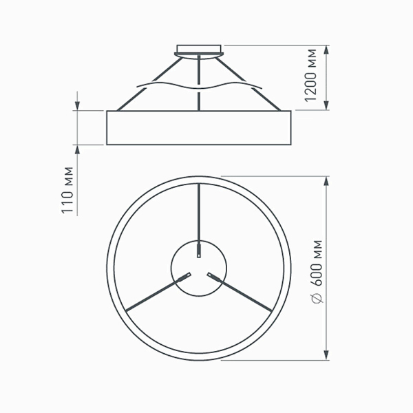 Размер светильника Ф600x110мм. Максимальная длина подвеса 1200мм.