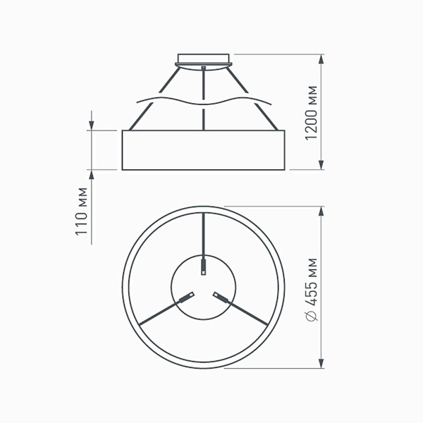 Размер светильника Ф455x110мм. Максимальная длина подвеса 1200мм.